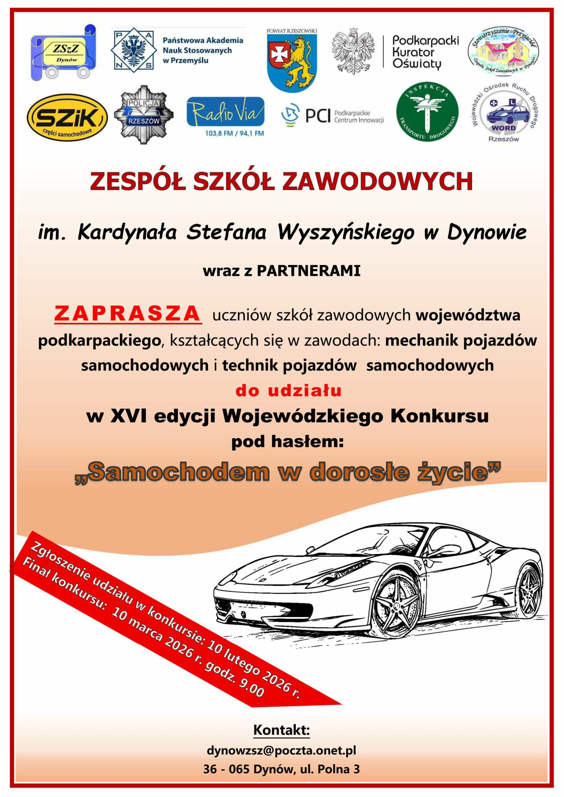 Zespół Szkół Zawodowych im. Kard. Stefana Wyszyńskiego w Dynowie uprzejmie informuje, że w dniu 10 marca 2026 r. (wtorek) organizuje XVI edycję Wojewódzkiego Konkursu pod hasłem: „Samochodem w dorosłe życie”.