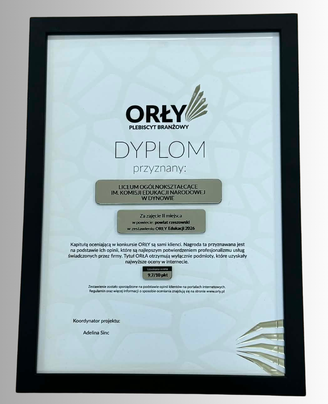 W plebiscycie „Orły Edukacji 2026” zdobyliśmy I miejsce w Dynowie oraz II miejsce w powiecie rzeszowskim spośród wszystkich placówek edukacyjnych działających na tym obszarze.